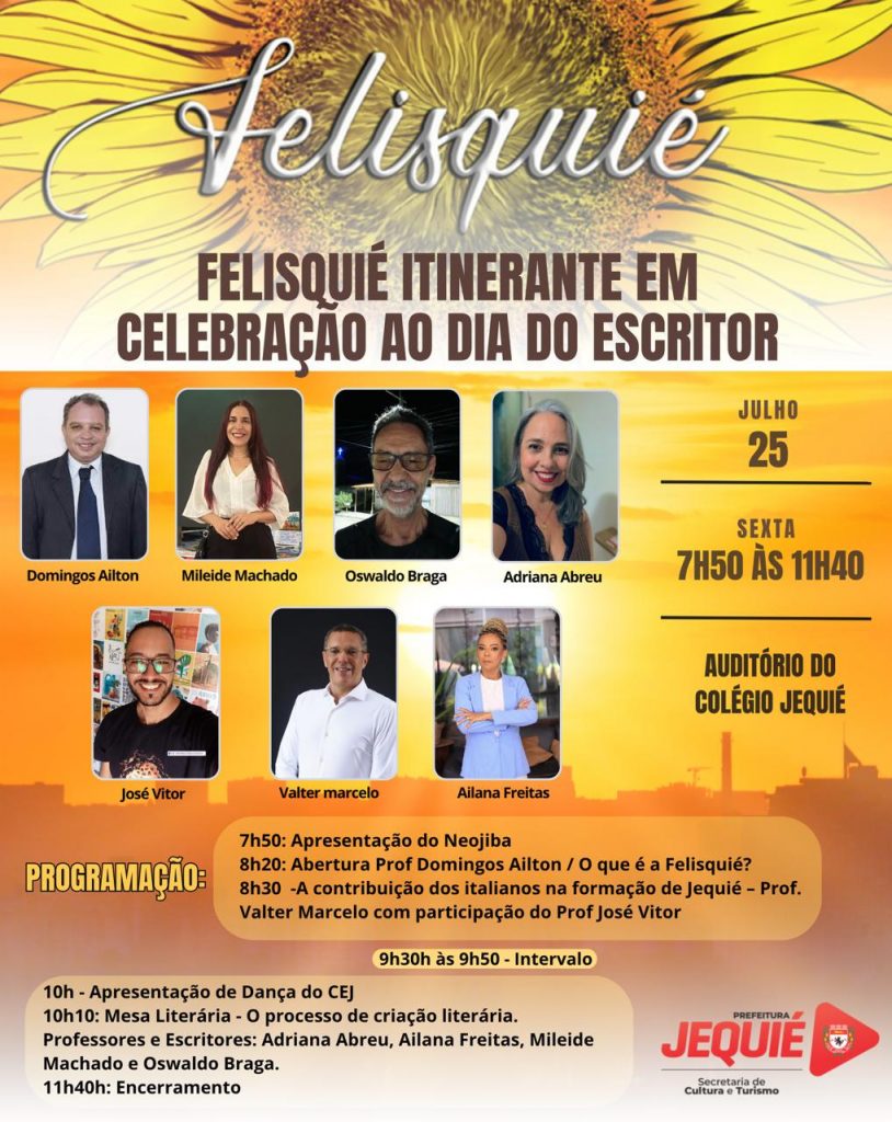 Na próxima terça feira, dia 29 de julho, às 18h na Academia de Letras da Bahia, no bairro de Nazaré em Salvador, será lançada a IX Edição da Festa Literária Internacional do Sertão de Jequié – Felisquié na Academia de Letras da Bahia, no bairro de Nazaré em Salvador.