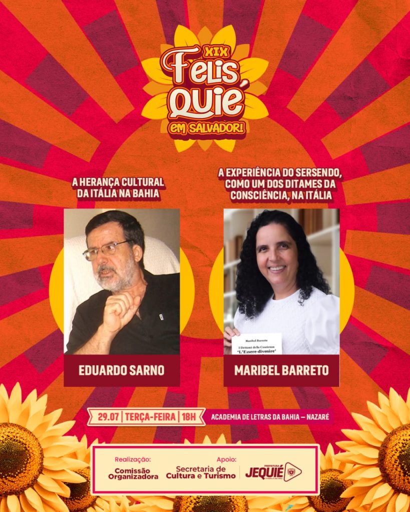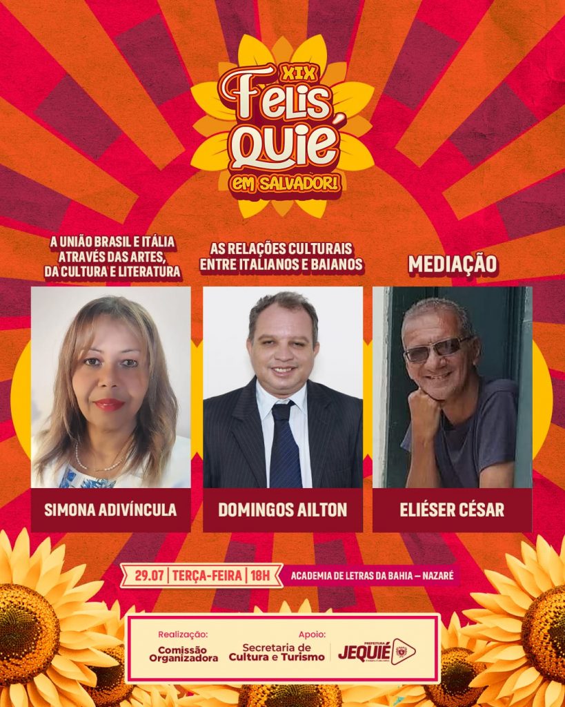 O evento terá uma mesa literária mediada pelo jornalista e escritor Eliéser César com os seguintes temas e palestrantes: “A herança cultural da Itália na Bahia – Eduardo Sarno; “A experiência do Sersendo, como um dos Ditames da Consciência, na Itália” -Maribel Barreto; ” A União Brasil Itália através das Artes, da Cultura e da Literatura -Simone Adivincula; “As relações culturais entre os italianos e baianos” – Domingos Ailton.
